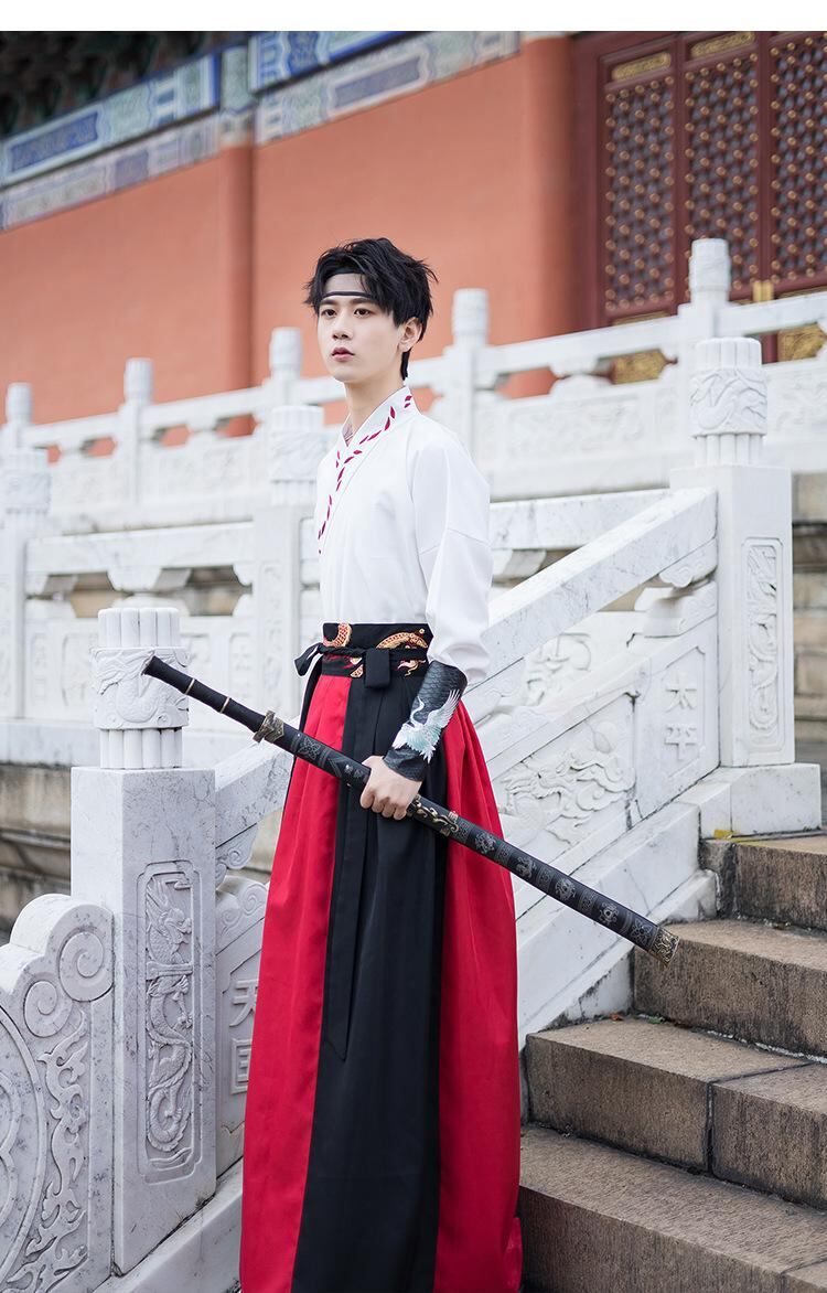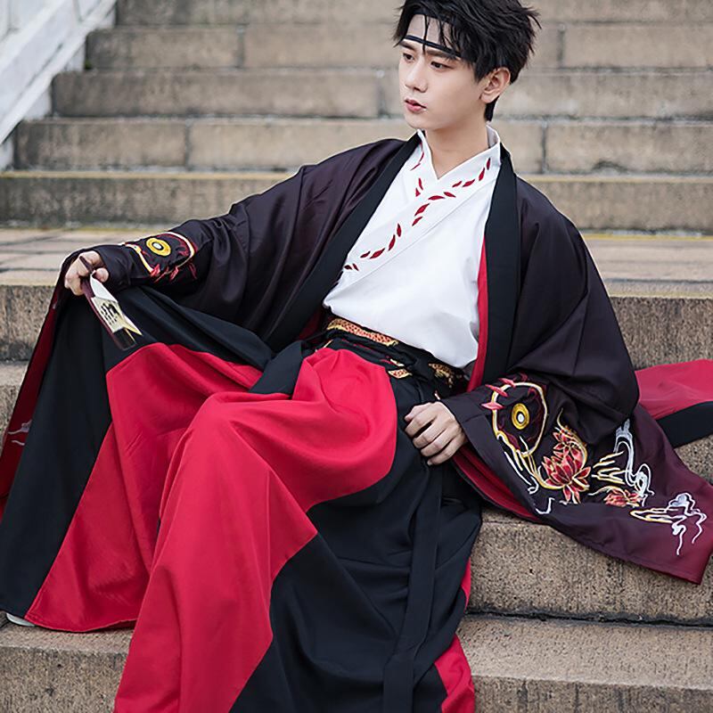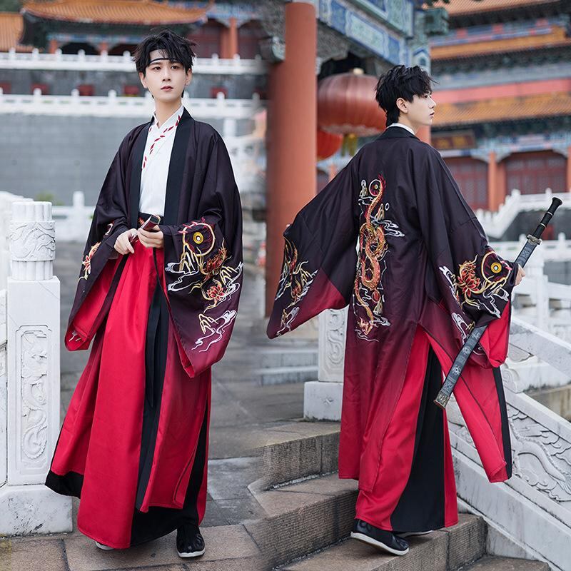 漢服 メンズ 男性用 ゆったりサイズ 中国民族風 蛟竜 龍柄 ワインレッド ワイドスリーブ 龍袍 3点セット 舞台 ステージ パフォーマンス衣装 セットアップ