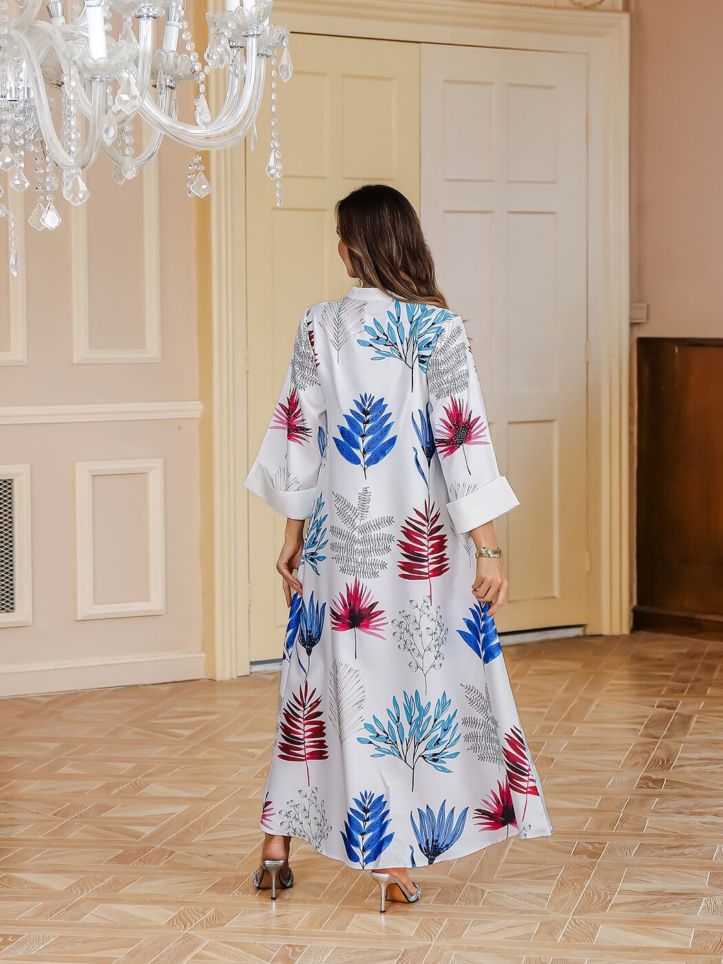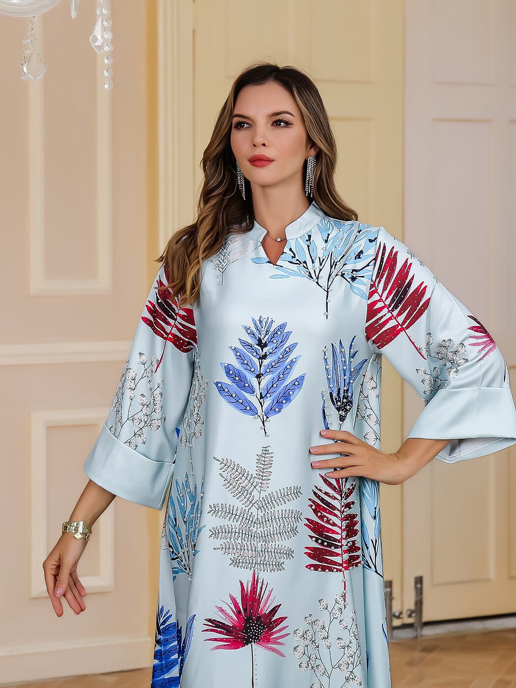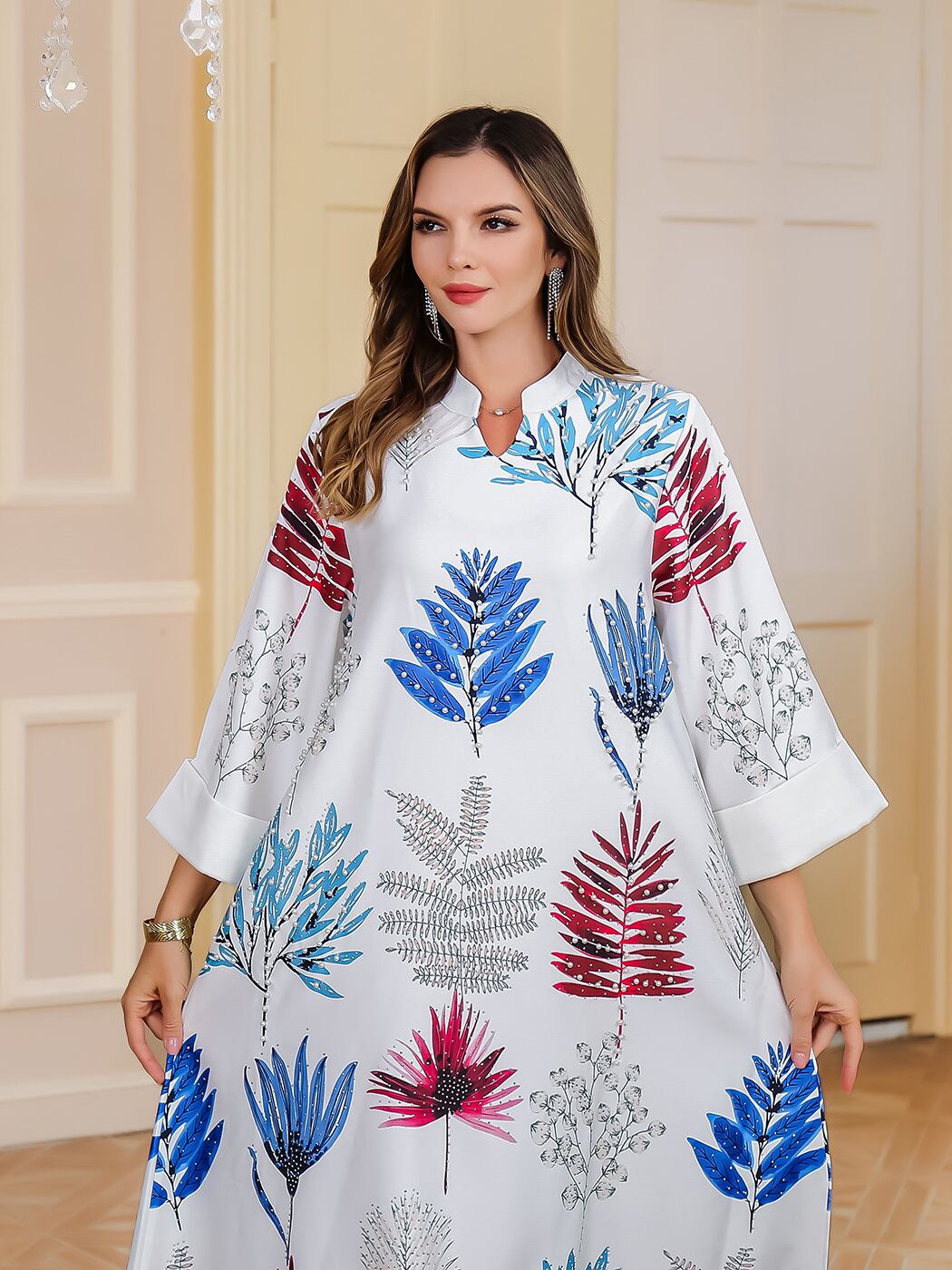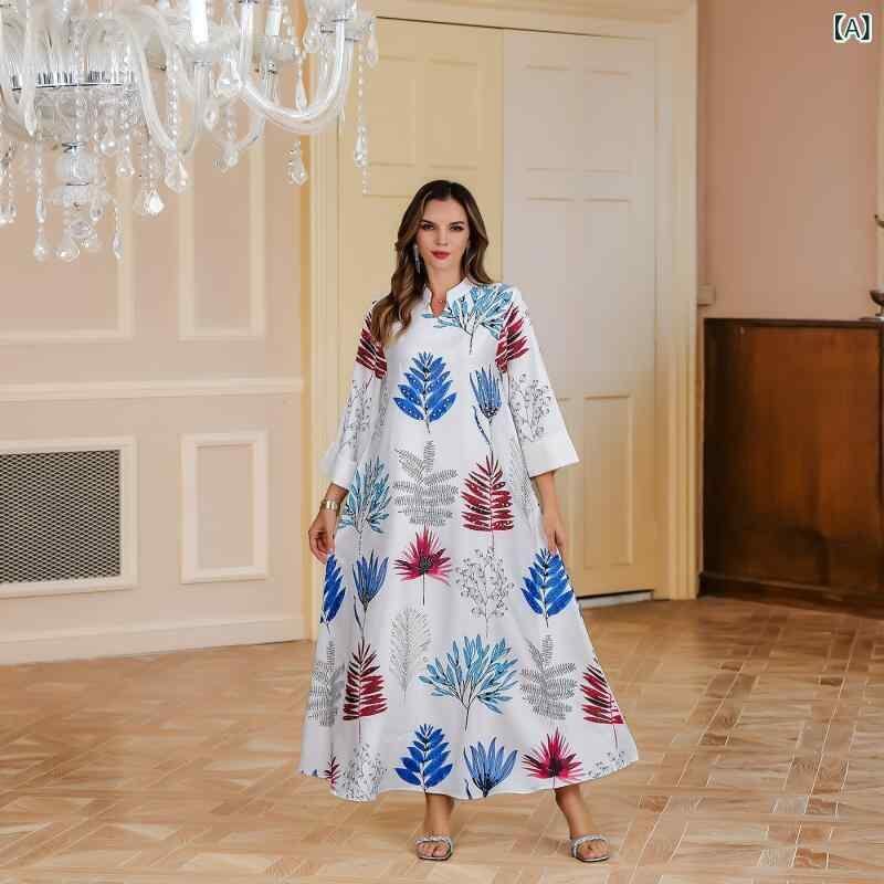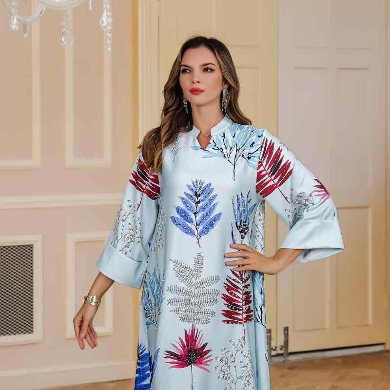 ワンピース イスラム アバヤ ラインストーン プリント ロングドレス 長袖 マキシ丈 ポリエステル 中東風 民族衣装 ホワイト ブルー 春夏